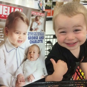 sorridente ao lado de uma revista que traz na capa o príncipe George e sua irmãzinha,