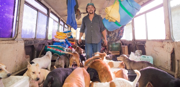 resolveu montar num ônibus antigo um abrigo para os animais. Alguns cães